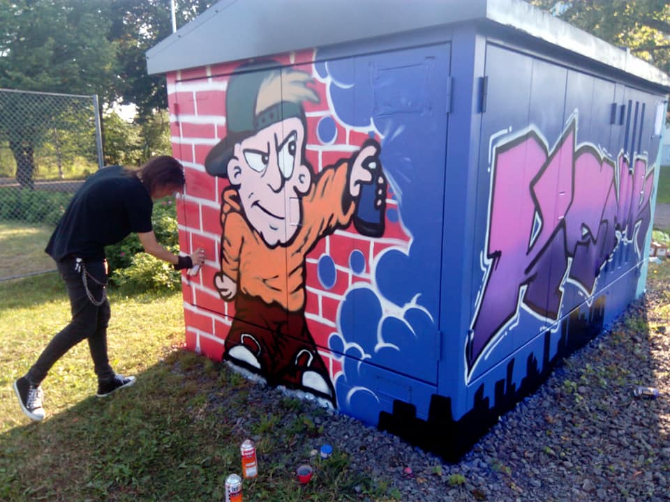 Katutaide tuli elämääni Kouvolan nuorisopalveluissa, jossa työskennellessäni nappasin kopin graffitipajojen vetämisessä vuonna 2015. Aloimme nuorten kanssa luomaan väriä ympäri betonista Kouvolaa laajentaen toimintaa erilaisiin tapahtumiin. Vuosien varrella nuoret kasvoivat tekijöistä tuottajiksi. Tällä hetkellä tiimiini kuuluu Sisu ja Arttu. Sisu maalaa perinteistä graffititaidetta ja Artun erityisosaaminen on erilaiset karikatyyrit. Molemmat pystyvät vetämään itsenäisesti pajoja. Voit myös tilata taidetta omiin tiloihisi.